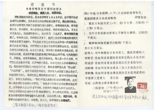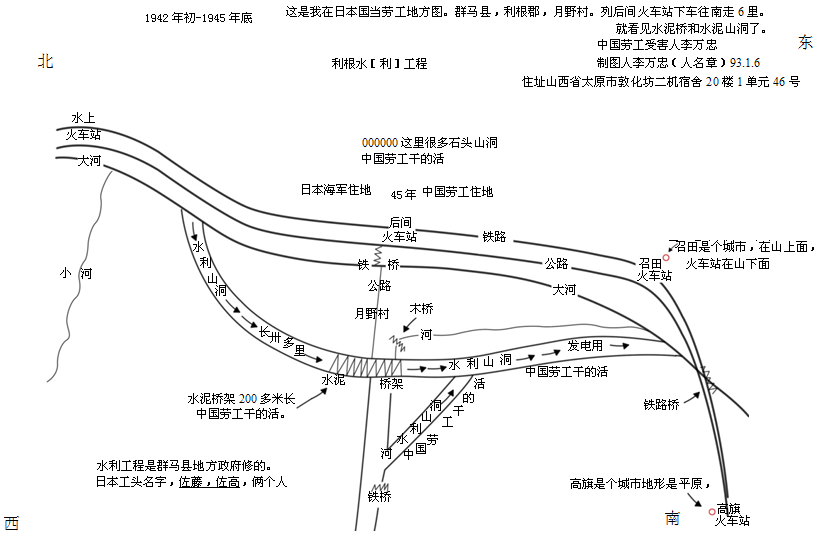 回忆我难忘的痛苦,是日本侵略军1942年初,在中国河北省大清河北扫荡时,抓很多劳工绑架押送塘沽集中营,我也被绑架去。在塘沽日军每天用刺刀看着我们强迫当劳工,有的装卸火轮、有的装卸火车、有的修路、非人道地狱生活特苦,经常有病死的人,3天5天发生跑人,被逮捕回来的人,被日军用刺刀杀死了,有的用刺刀刺死了。半年多以后,抓的劳工更多了,就押上火轮往东南走两夜两天半到日本国下关海口。下火轮后又押上火车往北走两夜一天到群马县后闲火车站下车后,把中国劳工分成6个队押送南面山沟里,这里就是利根川水利工程,全长三十多里,每个劳工队距离5里路左右,都住在山沟里,昼夜有军警巡逻看着我们每天进山洞干活,吃的是糠团子,不给饱,冬天不给棉衣,夏天不给单衣,每人发一个斗当布,叫中国人光着身体干活,从不叫劳工休息。日本代班工头手拿棍棒和皮鞭,每天都打中国劳工叫快快的干活,每天都骂中国人是“强古路”、“八格牙路”。由于无法忍受的痛苦,经常有人逃跑后又跳山自杀了,被逮捕回来的人,吊捆在树上用棍棒活活打死了,有的叫洋狗活活咬死了,日本工头讲话说:“你们中国人都是我们日本的强古路,逃跑的人都是我们日本狗吃的东西。”有很多中国劳工受尽迫害病死在那里,还有很多人在山洞里干活时,受伤的各种残废人和双目失明人。我的左手腕伤疤是当年日军用铁丝捆伤的,骨头受很大损伤。以上都是日本侵略军对我的侮辱和人身迫害,因此我要人格、我要国格、我要求日本政府讲良心、讲道德、讲人权,给中国劳工赔偿道歉。