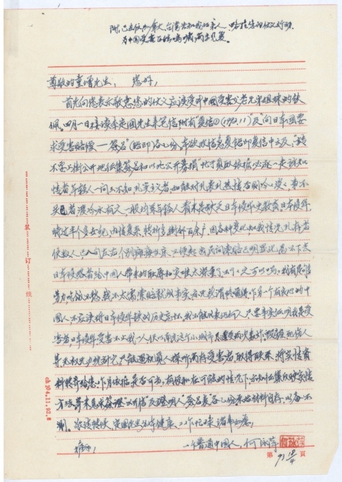 首先向您表示敬意,您的仗义应该受到中国受害父老兄弟姐妹的钦佩。四月一日接读李定国先生亲笔信,附有“复信①(1992.11)及“向日本国要求受害赔偿——签名”(铅印)各2份。本欲收信急复铅印复信中云及:“请不要上街公开地征集签名和以此公开募捐”忙于觅取依据,必逐一走访知情者,年轻人一问三不知,现实主义者,如能对现表现热情,否则冷冷淡淡,事不关己者,泼冷水有之,一般均系年轻人,看来是缺乏日本侵华史教育。日本侵华,时过半个多世纪,内情复杂,转折多。街邻百余户,因各种变化知我情况现存者仅数人,已八旬左右,个别瘫痪在床,不便[启]齿。民间索赔已明显化,忍不下去日本侵华者给中国人带来的耻辱和灾难太深重了。不了了之可以吗?我有足够劳力,吃饭不愁,钱不太需,索赔就成事实,亦无所谓,终觉得,作为一个有良心的中国人,不应该将日本侵华铁的历史忘怀。我不能代表[任]何人,只要事实证明我是受害者,日本侵华,受害不止我一个人,仅以南充这个小城市,尽遭受两次轰炸。毁房屋,死伤人等,无权无力统计它。只能遇机觅人探听尚存受害者,取得联系,将实情资料转寄给您,作为依据,是否可当?有便和在可能的情况下,示知征集反映实情方法。寄来恳求签证“公开信”及证明人“签名表”各2份。原始资料自存,以备不测。敬请转候,定国先生身体健康,工作忙绿,诸事如意!