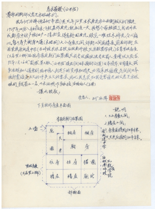 我名何泳萍(原名何辛酉)男,现年72岁,生长南充市小西街。祖父何陛建,1939年旧历八月初二,日本飞机轰炸南充就在这一天,我整个家被毁了。我因外出成都,家中财产被佃户一搂而空,得息赶回南充,眼见一堆烂木碎瓦,令人痛心。整个房产,街房三通(木结构)大小房屋九间,邻街二间有楼屋。前面邻街,左面紧挨原成达中学(当时校长张安钦,后改南师校,现为教育学院)右靠罗姓房屋(又名罗小脚)后抵李家花朝门后菜园。现有专攻国际法专业蜀人,童增,仗义直言,93年1月16日,“蜀报”第三版,“公开信”提出(向日本国讨公道)日本侵华,日军违反战争法规和人道原则,给中国人民造下的灾难和损失,必须承担赔偿。民间向日本政府索赔,是正义的呼声、正义的要求。因此我恳求知我受害情况的父老兄弟姐妹们,为我签上一名,以示证明,作为依据,留给后人(子孙)。