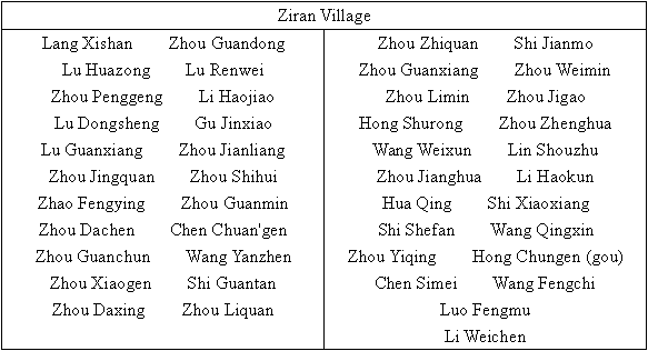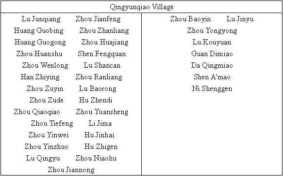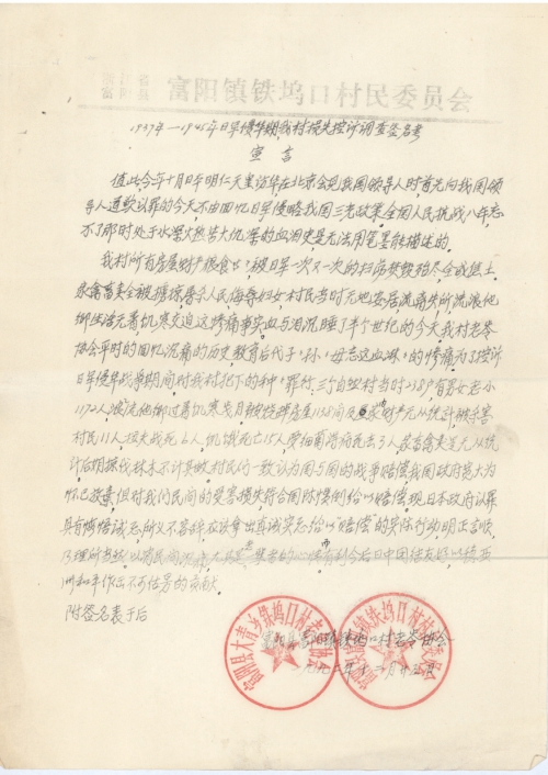 All the houses and property of my village were burned to ground by the Japanese army in sweeps. The livestock were robbed, people killed and women insulted. The villagers became homeless and began to live a vagrant life suffering from hunger and cold. The painful facts have been kept from the public for half a century. The Aging Society of my village will educate new generations about the bloody history. We charge the invading Japanese army with multiple crimes including causing 1,172 villagers (238 households) from 3 villages homeless, burning 1,138 houses and property within them and killing 11 villagers (excluding 6 villagers who were captured to be forced laborers and died, 15 villagers who were died of starvation and 3 villagers who died of bacterial diseases) and countless livestock, and chopping down innumerable trees. All the villagers agree that our government is generous enough to give up war reparations between governments, but the civilian damage compensation should be made in accordance with the international practice. Now the Japanese government sincerely repents of its sins, but it should take practical action to compensate us, which is just and reasonable. Moreover, the Japanese government compensating Chinese people will not only ease their pain especially the older generation, but is conducive to the Sino-Japanese friendship in the future and will make immeasurable contributions to peace in Asia.