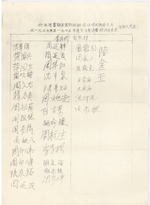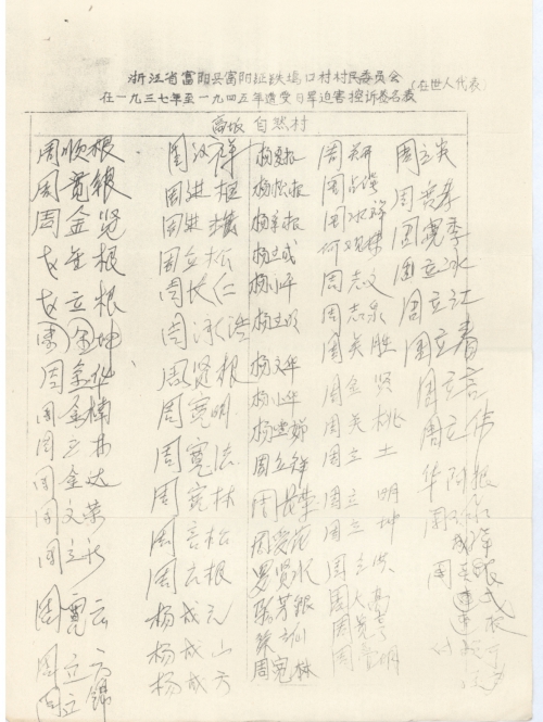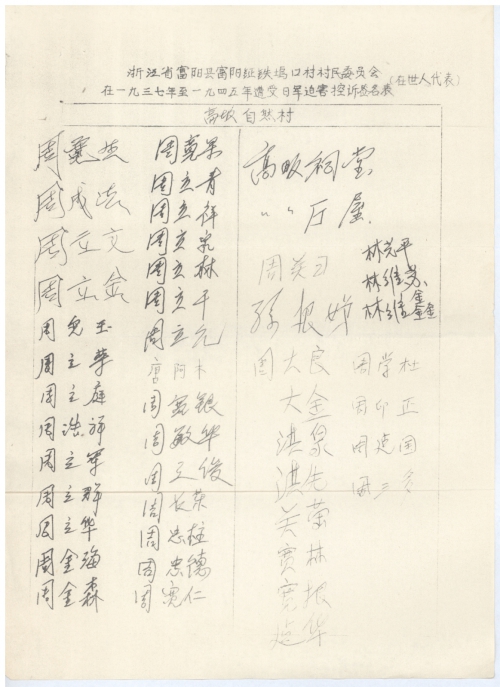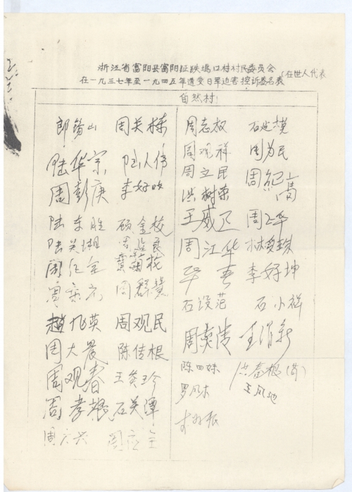 Signatures of villagers (living representatives) being victimized by the Japanese army during 1937 and 1945