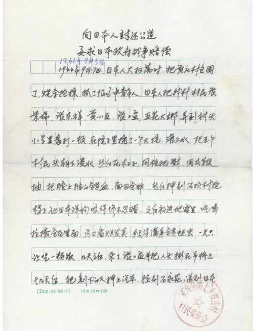 细节:1942年9月5日,日本人大扫荡的时候抓了我村村民贾小五、张东祥、张景瑞和张二孟,经过日军用残忍的手段折磨后他们伤口腐烂发臭,爬的满身都是蛆虫。几天后张二孟被杀害剩下的人被押送到日本做了劳工,家里的财产也几乎被日军抢光。日本人伤天害理,伤害无辜百姓,我们作为后代有权利向日本人讨还公道要回赔偿。备注:信封丢失