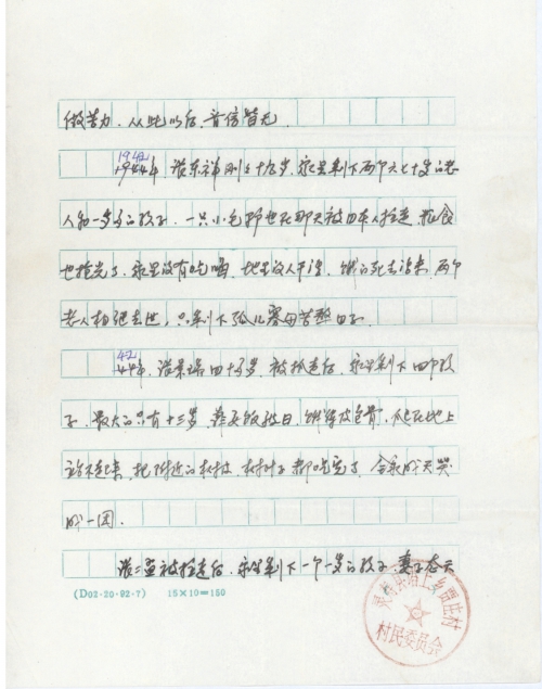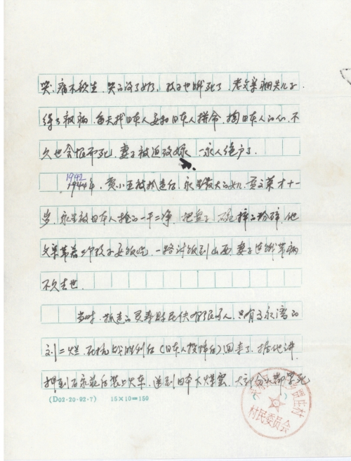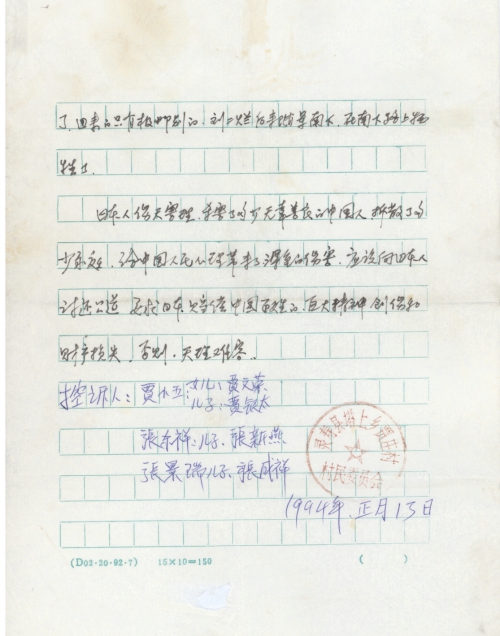 Other details:On September 5, 1942, the Japanese troops caught our villagers Jia Xiaowu, Zhang Dongxiang, Zhang Jingrui and Zhang Ermeng in their mopping-up. The villagers were cruelly tortured by the Japanese soldiers, leaving their wounds rotten and their bodies covered with maggots. A few days later Zhang Ermeng was killed, and the rest were sent to Japan to do hard labor. The property in their houses was almost looted by the Japanese soldiers. The Japanese soldiers did things that are against reason and nature and hurt innocent people. As the victims’ offspring, we have the right to claim for compensation and seek justice from the Japanese government. Note: The envelope was lost.