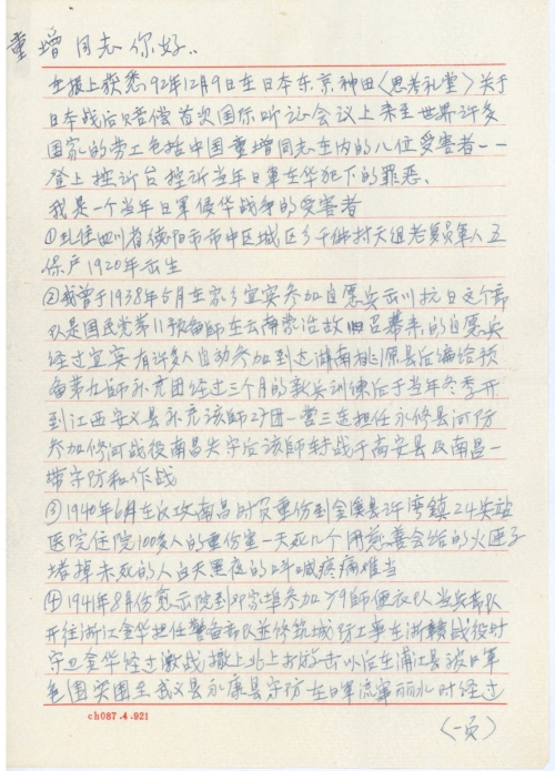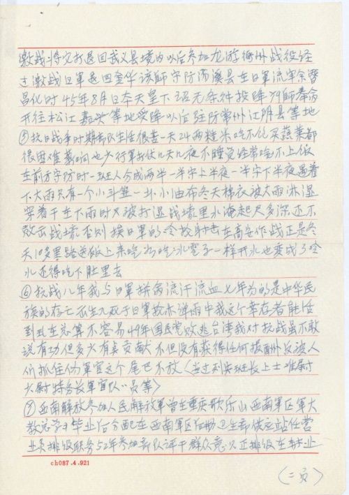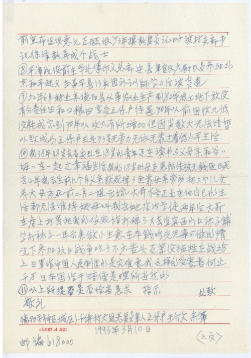 ⑩我38年,18岁去当兵,现在18岁的青年还在读书,与父母亲和爷爷姆姆(奶奶)在一起过幸福生活,我的18岁时,母亲患肺结核无钱医,已死去,4年我出生前几个月,父亲就死掉了,全靠母亲劳动把三个儿女养大,母亲死前二月,二姐出嫁,大哥不务正业,连他自己的生活都无法维持,姨母叫我去她店内学徒,两年后,大哥在店上打骂,把我的饭碗给打碎了,又去宜宾西门口袜子铺学打袜子,一年出来做小生意,在本钱吃光无事可做的情况下参加抗日战争,吃了不少苦头,还算没牺牲在战场上,日军给中国人民制造的是灾难,[像]我这样的受害者,何止千万,日本国给予赔偿是理所当然的。