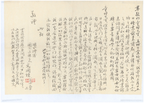 童增先生:你我本为陌生。此事如果同志帮忙相成。他日当登门重谢。古人云滴水之恩当以涌泉为报。此事能成又何止滴水。先生:本人年已六五平素清寒。鬼子给我们的灾难是深重的。所造成的后遗症是不好启口的。故此次对先生之义举。我是十分敬仰的。我以一个平民的身份既向先生求援。也敢向曾经是我们的敌人的日本索赔。我确实也是冒昧点。如果是我们的政府说我世故闹事。要加罪给我那一切后果当然是由我负责。相反事成了我一定会进京登门谢恩的。请收信后回示给我使我放心,也即是知道此信收到了。一切帮忙拜托了。