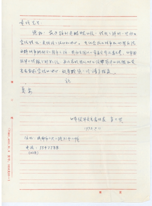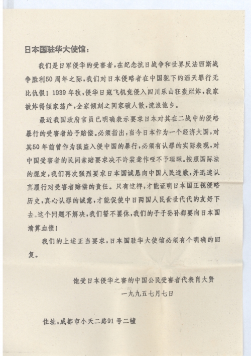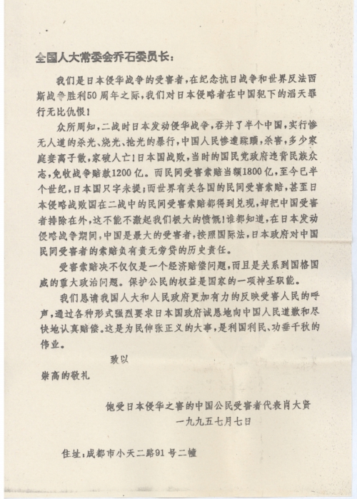 最近接到吴鹏同志的信,使我了解到一些向日索赔情况,更增强了信心和决心。在纪念抗日战争和世界反法西斯战争胜利50周年之际。我向全国人大常委会乔石委员长,日本国驻华大使馆分别写了信,再次表明我们对日侵华罪行的仇恨和受害者要求索赔的决心,现寄给您一份请多指教。