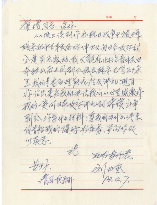 从报上读到你为抗日战争中被日军残杀的千万平民百姓伸张正义向日本政府讨公道实为感动。我父亲在1943年春被日本驻山西大同部队抓去残杀已有五十余年,我们是老百姓能找谁去讲[理]。现有你站出来为我们讲话,我们从心里感激你。我们一定向日本政府讲[理],讨赔偿斗争到底,你要什么材料?要我们办什么请来信告知,我们随时准备着,并向你致以敬意。