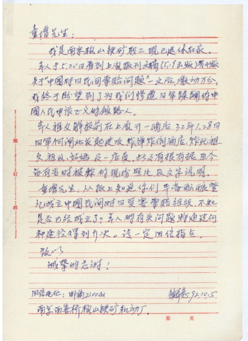 童增先生:从报上知道你们准备酝酿登记成立中国民间对日受害索赔组织,不知是否已经成立了?本人的有关问题将通过何种途径得到解决。请一定回信指点。
