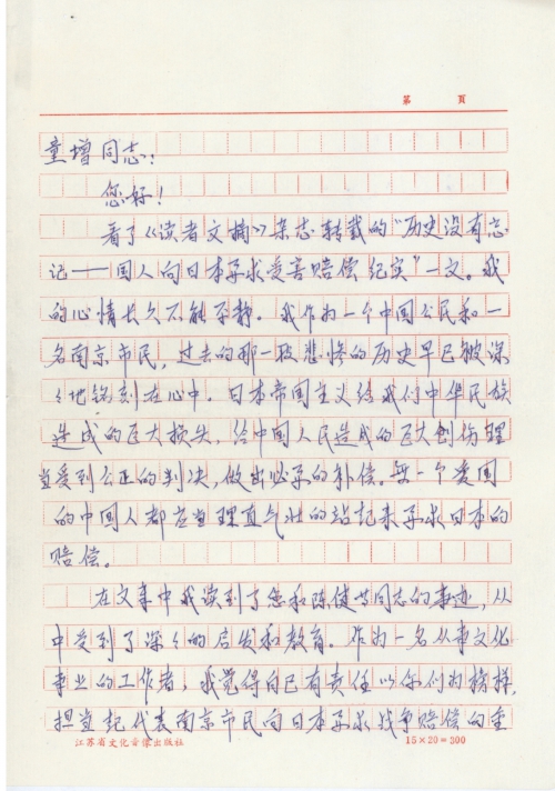 在文章中我读到了您和陈健等同志的事迹,从中受到了深深地启发和教育。作为一名从事文化事业的工作者,我觉得自己有责任以你们为榜样,担当起代表南京市民向日本要求战争赔偿的重任,要求日本政府承担南京大屠杀中遇难的三十万南京市民及其家属的损失共计受害赔偿约200亿美元。