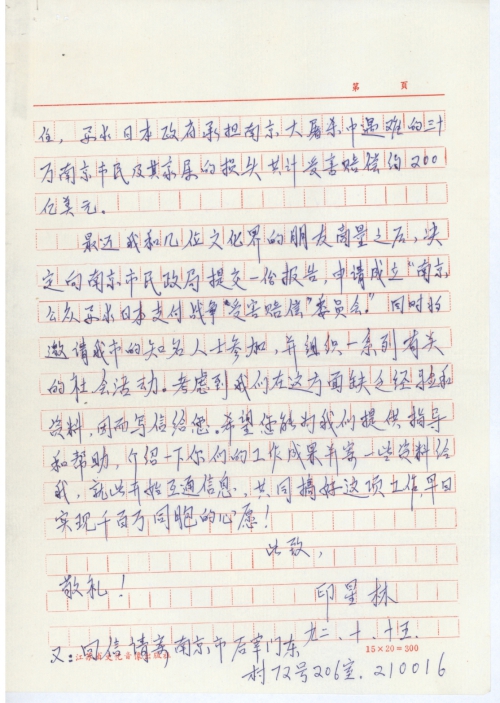 最近我和几位文化界的朋友商量之后,决定向南京市民政局提交一份报告,申请成立“南京公众要求日本支付战争“受害赔偿”委员会”。同时将邀请我市的知名人士参加,并组织一系列有关的社会活动。考虑到我们在这方面缺乏经验和资料,因而写信给您。希望您能为我们提供指导和帮助,介绍一下你们的工作成果并寄一些资料给我,就此开始互通信息,共同搞好这项工作们早日实现千百万同胞的心愿!
