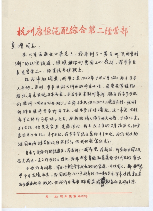 在《东西南北》杂志上,我看到了一篇名叫“民间索赔潮”的纪实报道,深深被你们爱国之心感动。我爷爷也是受害者之一,故来信与你联系。