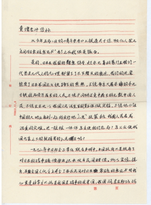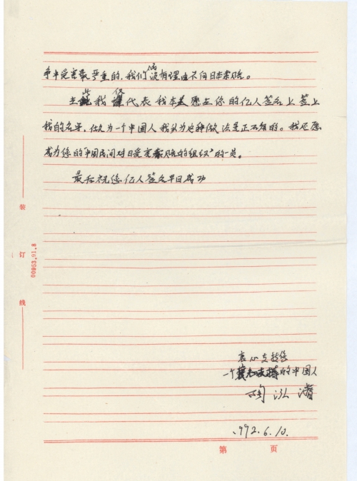在此我仅代表我本人愿在你的亿人签名上签上我的名字,[作]为一个中国人我认为这种做法是正确的。我还愿成为您的“中国民间对日受害索赔的组织”的一员。