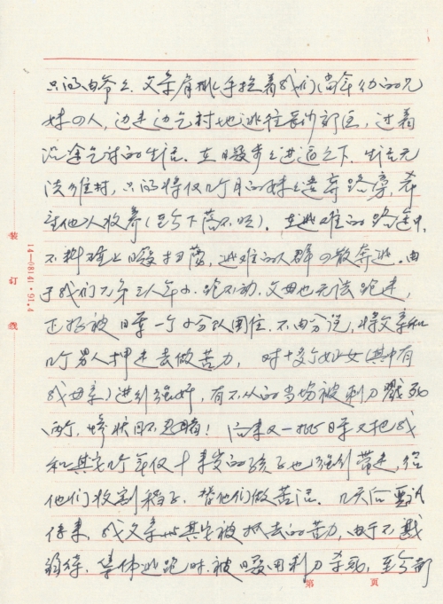 同时,也激发起我这个受害者的无比义愤!1944年前后,日寇三次侵犯长沙市,其中一次大火把长沙烧的鸡犬不留,我爷爷和父亲经营的“王记南货商店”被烧的精光。1944年4~5月间,日寇三次侵入长沙市,我们一家祖孙三代七口人由于无力逃往远处,只得由爷爷、父亲肩挑手拉着我们尚年幼的兄妹四人,边走边乞讨地逃往长沙郊区,过着沿途乞讨的生活。在日寇步步进逼之下,生活无法维持,只得将仅几个月的妹妹遗弃路旁,希望他人收养(至今下落不明)。在逃难的路途中,不料碰上日寇扫荡,逃难的人群四散奔逃。由于我们兄弟三人年小,跑不动,父母也无法跑走,正好被日军一个小分队围住,不由分说,将父亲和几个男人押走去做苦力,对十多个妇女(其中有我母亲)进行强奸,有不从的当场被刺刀戳死两个,惨状目不忍睹!后来又一批日军又把我和其他几个年仅十来岁的孩子也强行带走,给他们收割稻子,替他们做苦活。几天后噩讯传来,我父亲与其他被抓去的苦力,由于不戡(“戡”编辑为“堪”)弱(“弱”编辑为“虐”)待,集体逃跑时被日军用刺刀杀死,至今不知尸体在何处!爷爷闻讯,一病不起,没有几天也一命归天!从此,只靠母亲带着我们三兄弟(十岁、六岁、三岁)过着乞讨生活。回到长沙一看,又无家可归了。当时家住长沙小吴门外杜家山,日寇侵入后把那一带移(“移”编辑为“夷”)为平地,修成了军用飞机厂,中国百姓不准进入。就这样使我们一家人在饥寒交迫的死亡线上挣扎着,直到日寇投降,我们兄弟二人进了保育院,母亲带着小弟改了嫁。