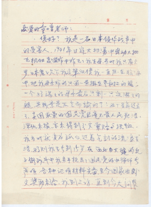 我是一名日本侵华战争中的受害人,1941年日寇大扫荡中出动大批飞机狂轰滥炸中炸飞了我生母,当时我只有六岁。日本鬼子欠下我这笔血债我一直压在脑海中,把我母亲炸的只留一条挂在枣树上的腿,一个好端端的母亲最后只剩一只血淋淋的腿,其[惨]景是不言而喻的了。五十多年过去了,卖国求荣的国民党丝毫不管人民死活,深仇未报,亦未得到分文索赔与抚恤,我当时就变为孤儿,过着乞讨的流浪生活,好则我生长到15岁,在西北大捷的瓦子街战斗中我亲手枪击了国民党的中将师长严明,各种证明材料完备,至今国家也分文奖励未给,我到上访,直到今天问题仍石沉大海,无人问津。