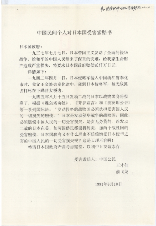 细节:1942年4月1日,日本军侵入浙江奉化市,我的父亲去奉化途中碰到侵略者后被无故抓去打死在大桥边上。日本对中国百姓的所作所为有什么理由不赔偿,日本政府必须赔偿受害者。:备注:信封丢失