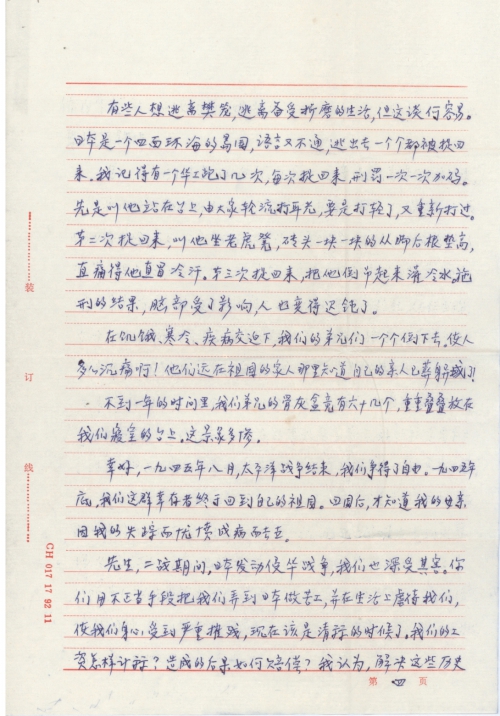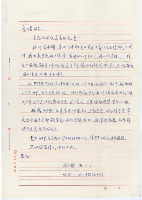 I am Feng Chengyao, a retired cadre from the Trade and Industry Bureau of Fengdu, Sichuan. During World War II, I was deceived in Shanghai to become a laborer for Wanishi Iron & Steel Manufacturing Company in Muroran, Hokkaido, Japan, just like Wang Duanbi of Chongqing (then he was called Wang Shiling and I was called Wen Ruolin). We were tormented and suffered unspeakable pain in Japan.