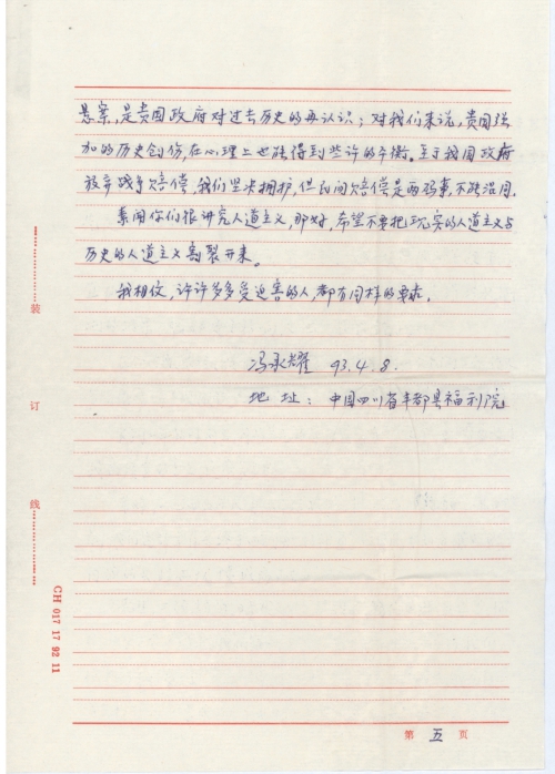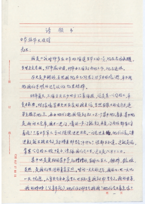 Mr. Ambassador, Japan launched the war of aggression against China during World War II and we suffered greatly from it. You used improper means to lure us to perform hard labor in Japan and tortured us. We were severely abused both physically and mentally. Now it is time for settlement of the score. How to calculate our wages? How to compensate for the consequences of your acts? I think solving these historical issues will help your government relearn history. To us, such redress perhaps can help your country achieve a better psychological balance despite the historical destruction forced on us. We firmly support our government’s decision of giving up war reparations, but civilian compensation is an entirely different matter from that. The two matters should not be confused.