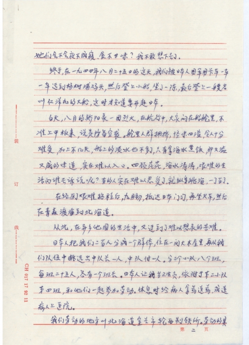 I was one of the many Chinese laborers in Hokkaido, Japan during World War II. My current name is Feng Chengyao and my name was Wen Ruolin when working as a laborer in Japan. I returned to China at the end of 1945, was transferred to work in Sichuan from Shanghai in 1949 and I am retired now.