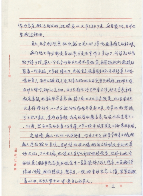 Most of us were young. But we were provided with little food despite heavy physical labor. Each of us was given a small rectangular wooden box with some loose rice grains mixed with unknown wild vegetables (tough to chew) in it most of the time. Some laborers were so hungry they would pick up fish bones from the ground, wipe off the dust, roast them in the oven and eat them. Due to a long-term lack of calories and nutrition, we were extremely weak, likely to get ill and less likely to recover from illness. Winter came early in Hokkaido. Snow fell in November, with wind roaring from the north. The streets were covered with feets of snow and the paths along the streets were covered by thick layers of ice. The temperature was often minus twenty or thirty degrees. However, we still wore thin clothes because the Japanese did not provide us with enough clothes to withstand the cold.