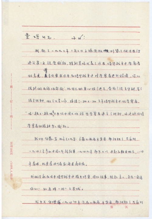 我阅了一九九三年二月三日文摘周报,刊登了向日本讨还公道一文很受感动,特别是你代表了日本侵华战争中受害者的意见,曾多次要求日本在侵华战争中对受害者进行赔偿,你以强[烈]的民族使命感把自己的身心投了进去,查阅了很多资料,写了很多材料,做了大量工作,接待了一批又一批当年侵华战争中的受害者。你一趟又一趟地去日本住中国大使馆替受害者递交了材料,你这种同情受害者的精神令人感动。