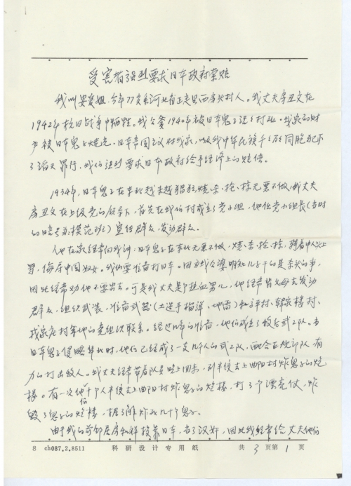 Other details:Regardless of our efforts to persuade him not to, my husband resolutely took part in the War of Resistance Against Japan. He was captured by the Japanese soldiers and was tortured cruelly. He was injured so seriously that he died soon. When the Japanese soldiers mopped up in our village, they caught my father-in-law. The Japanese soldiers forced him to cook for them. After they were full, they hung my father-in-law on a tree and beat him. They even bayoneted him in the neck repeatedly, and tortured him to death. My family was ruined by the Japanese invaders. I have the right to require the Japanese government to compensate for the debt of blood.