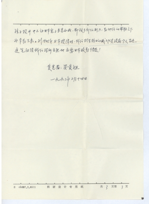 I am An Aijie, 77 years old, born in Xifangtou Village, Zhengding County, Hebei Province. My husband Fang Chouwen died in 1942 during the War of Resistance against Japanese Aggression. My father-in-law was beaten to death by the Japanese devils in 1940. My family’s property was burned down by the Japanese. The Japanese imperialists committed heinous crimes against my family and other tens of thousands of compatriots. We strongly demand economic compensation from the Japanese government.