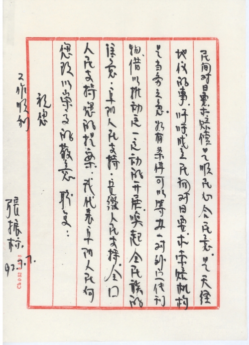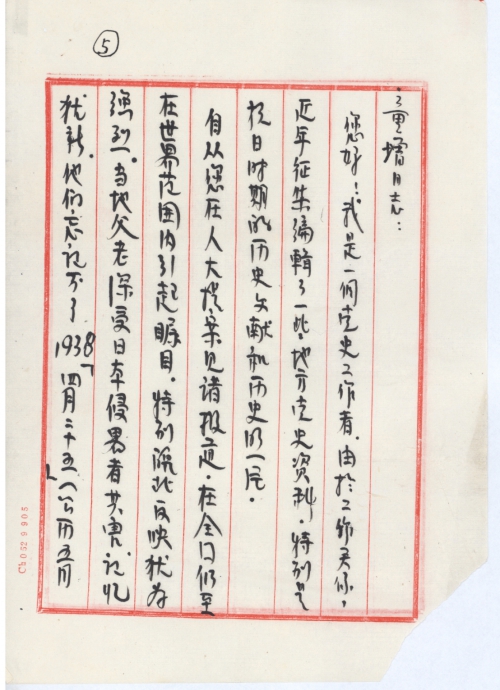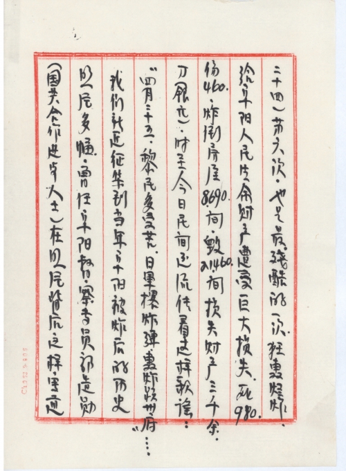 民间对日要求赔偿是顺民心合民意,是天经地[义]的事,呼吁成立民间对日要求索赔机构是当务之急。如有条件可以筹办一对外宣传刊物借以推动这一运动的开展,唤起全民族的注意,平阳人民支持,安徽人民支持,全国人民支持您的提案。我代表平阳人民向您致以崇高的敬意,盼复。