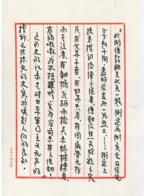 自从您在人大提案见诸报道,在全国[乃]至在世界范围内引起瞩目。特别皖北反映[尤]为强烈。当地父老深受日本侵略者其害,记忆犹新。他们忘记不了1938「四月二十五」(公历五月二十四)第六次,也是最残酷的一次,狂轰[滥]炸,给平阳人民生命财产遭受巨大损失,死980伤460,炸倒房屋8690间,毁21460间,损失财产三千余刀(银元),时至今日民间还流传着这样歌谣:“四月二十五,黎民多受苦,日军撂炸弹轰炸颖州府”……我们就近征集到当年平阳被炸后的历史,照片多幅,曾任平阳督察专员郭造勋(国共合作进步人士)在照片背后这样写道:“此街系鼓柚至此关一段,街道两侧商店及住宅分下数千间,轰炸后变为一片焦土……街道上扶老携幼络绎不绝者。係劫后焦头烂额之灾民,有父寻子者,有妇寻夫者,有因尸骨无存而哭泣者,有翻掘瓦砺而捡点未烬棵檩者,哀鸿嗷嗷为状极惨,实为空前未有之浩劫!”