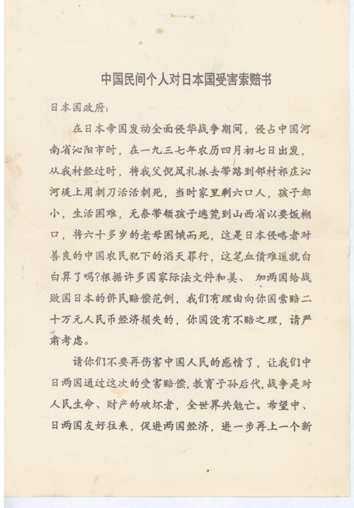 中国民间个人对日本国受害赔偿书