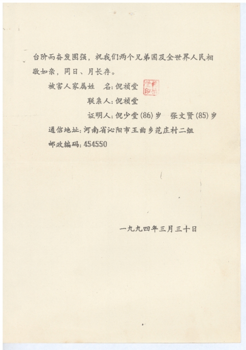 证明人:倪少堂(86岁) 张文贤(85岁)