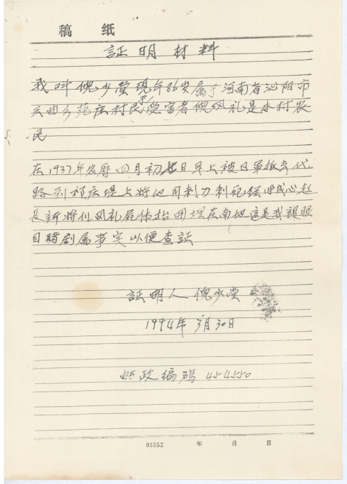 细节:1937年农历4月7日日本侵略者途径我村将我父亲抓到河提上用刺刀活活刺死,从此家里生活极为困难,老母困饿而死。这笔血债日本政府必须赔偿。附上证明材料。