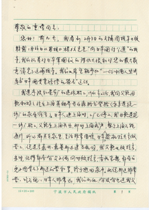 由于我当时年纪还小,母亲迫于生活,对于父亲的去向也无从过问,日本人投降后,这一大批被抓去的劳工去向以及如何被残害的?是否被送往日本?我们不得而知。这次,我们看到童增等同志发起的“向日本国要求受害赔偿”运动,使我再一次激起了对日本军国主义的无比仇恨,希望童增等同志把这一运动推进到使日本国正式谢罪和进行赔偿为止。为千千万万受苦者和被迫害的家属[伸]张正义。