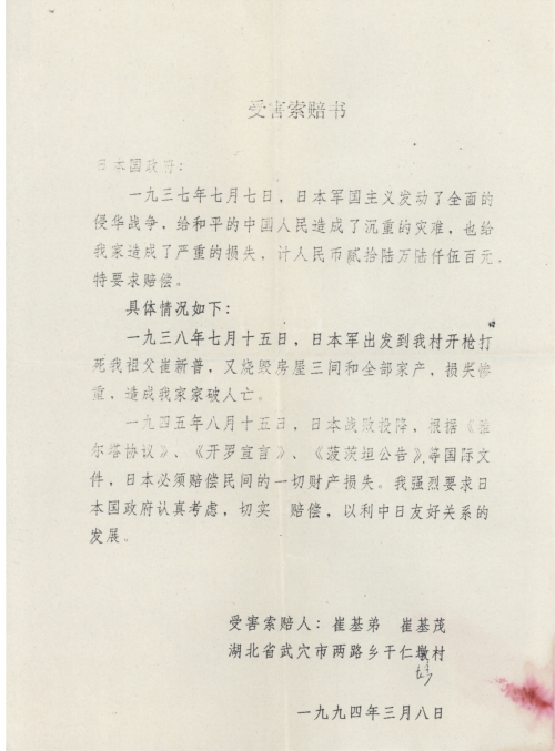 今天读《文摘周报》1993年2月3日第四版载《向日本国讨公道》一文,心情非常激动。你发起的“向日本国要求受害赔偿”的活动,不仅大长了中国人民的志气,而且对于不少忘记了五十年前国耻的人,也是一个极好的教育。