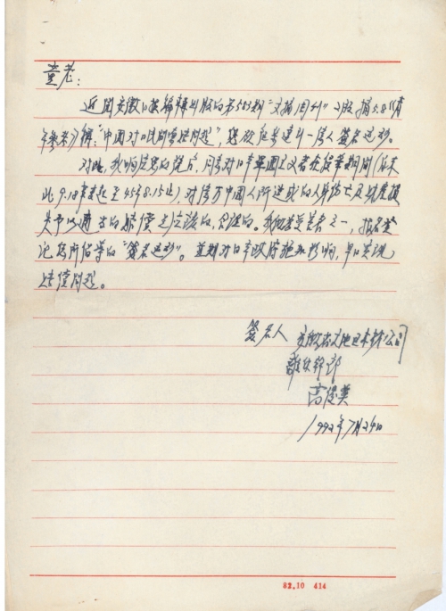 对此,我响应您的号召,同意对日本军国主义者在侵华期间(自东北9.18事变起至45年8.15止),对亿万中国人所造成的人身伤亡及财产损失予以适当的赔偿是应该的,合理的。我作为受害者之一,报名登记您所倡导的“签名运动”。并期对日本政府施加影响,早日实现赔偿问题。