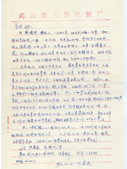 父亲死后,大伯心中是明的,家中遗留是有点田地,大伯是长子,所以由大伯掌管,父亲做点小生意,又没住一起,田地之事也未过问,事过不久,大伯就逼着母亲改嫁。我最小,母亲只把我带在身边来给人烧火弄饭,大姐给人做丫头,十二岁在申新纱厂细纱车间做过童工。哥哥,十四岁在武汉船舶厂做学徒,小姐丢在乡下给人烧火弄饭,从此一家人四分五[裂]。解放前夕,大伯也已经破产。64年四清运动中,外调人员跟母亲说,情况跟母亲所述一样,但不知后来又着为漏网地主认处,母亲的党员被劝退,文化大革命后平反,恢[复]为城市贫民(解放后,母亲摘于道工作58年入党)。
