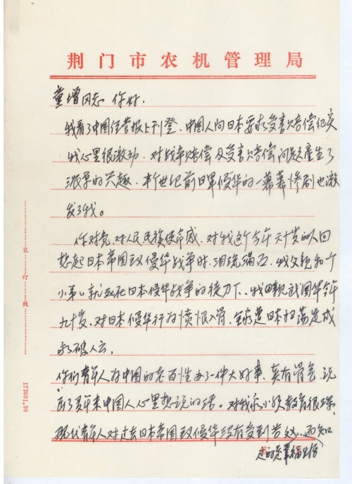 我在荆门市农机局老龄委员会,作(“作”编辑为“做”)老龄工作,沙洋区人,沙洋镇过去和现在都是荆门市比较大的一个集镇,交通方便,四通八达,鱼米之乡市场活跃的好地方。我把日本侵略者在荆门犯下的罪恶事实,初步向你作个介绍。