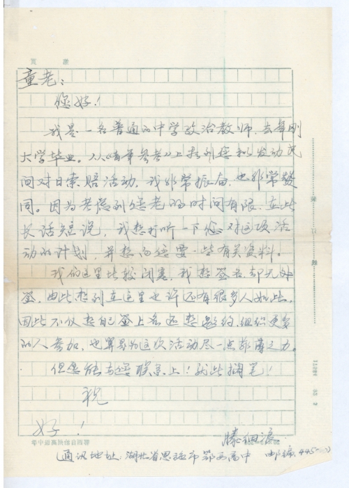 我是一名普通的中学政治教师,去年刚大学毕业。从《青年参考》上看到您拟发动民间对日索赔活动,我非常振奋,也非常赞同。因为考虑到您老的时间有限,在此长话短说,我想打听一下,您对这项活动的计划,并想向您要一些有关资料。
