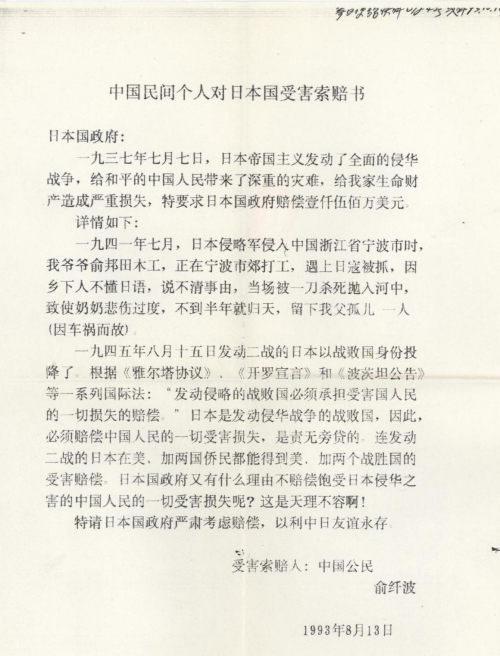 中国民间个人对日本国受害索赔书