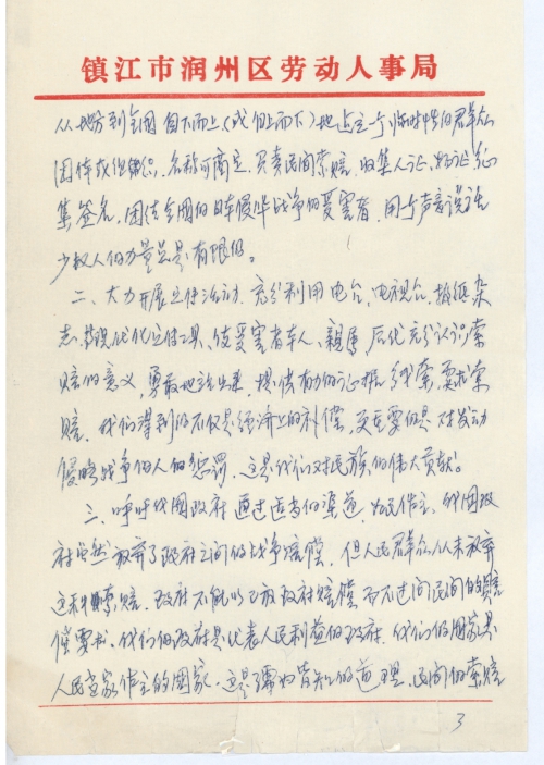 一、为尽快做好此项工作(可能需几年、十几年、几十年),从地方到全国自下而上(或自上而下)地建立一个临时性的群众团体或组织,名称可商定,负责民间索赔、收集人证、物证、征集签名,团结全国的日本侵华战争的受害者,用一个声音说话,少数人的力量总是有限的。