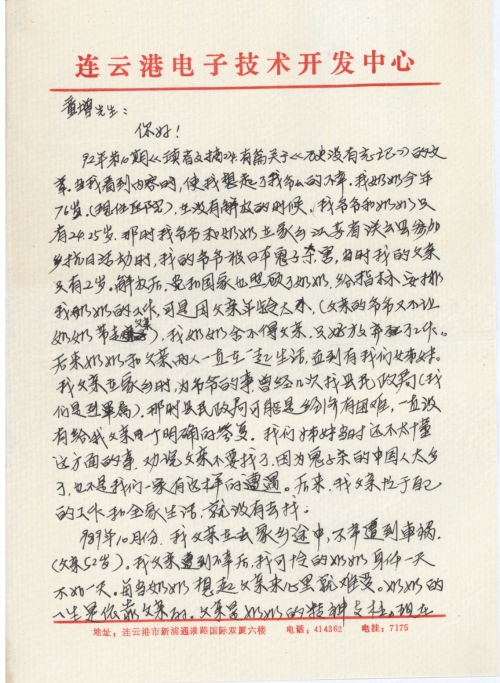 童增先生,[像]我奶奶这样的情况,也不是属于一位受害者的家属吗?我[作]为奶奶的孙女,代奶奶写这封信,也算为奶奶签个名吧!