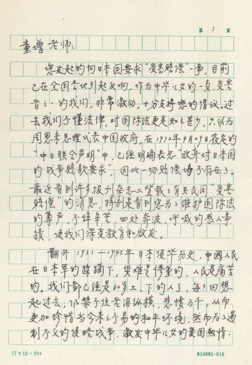您发起的向日本国要求“受害赔偿”一事,目前已在全国各地引起反响,作为中华儿女的一员,受害者之一的我们,非常激动,十分支持您的倡议。过去我们不懂法律,对国际法更是知之甚少,只认为周恩来总理代表中国政府,在1972年9月29日签定的“中日联合声明”中,已经明确表态“放弃对日本国的战争赔款要求”,因此一切赔偿均不存在了。最近看到许多报刊杂志上登载了有关民间“受害赔偿”的消息,特别是看到您为了维护国际法的尊严,不辞辛苦,四处奔波、呼喊的感人事迹,使我们深受教育和启发。