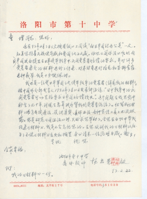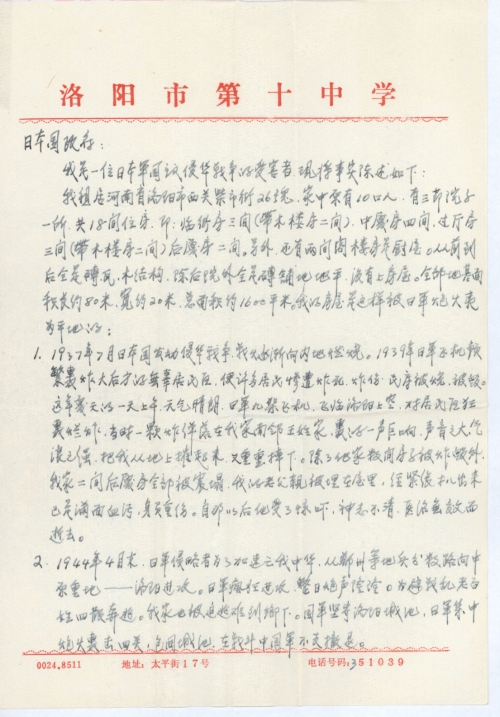 当日军占领洛阳后,四关民房已被日军炮火焚烧殆尽,冲天大火数日不熄。待安定后我家从乡下返回,母亲看到我家房屋、财产什物等在日军炮火中化为灰烬,只剩下断垣残壁,一片瓦砾和未燃尽的袅袅余烟,什么都没有了。当时我老母亲经不住这种打击,就气懵过去了,经抢救才有好转。但我母亲从此身染重病。我家当时居住、衣食等生活也陷入困境。在日军侵占洛阳的一年多时间里,我家吃、住等完全靠亲友周济和借债度日。生活的困难,苦不堪言,战争之罪恶真是罄竹难书。所借亲友之债,到现在也未尝还清。我的老母亲也因缺乏医疗和营养等费用,也含恨而逝。