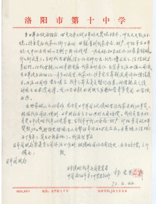我也是一位受日本军国主义侵华战争的受害者(详见我的材料)。据中国外交部发言人1992年3月11日发表讲话说:“日中战争中的民间受害者可以直接要求日本国赔偿损失。”这个问题在我思想中盼望了几十年,到现在政府总算替我们受害者说话了。但写成《材料》后怎样投递法,没讲清楚,具体办法,各种宣传工具上也没披露。您是研究《国际法》的,只好求您帮助了。望您在百忙中帮我投递《材料》,我是不会忘记您的。在您收到我的材料后,为了不使《材料》丢失和搁置,务必请来一信说明为感。谢谢!