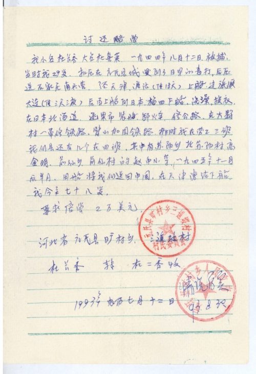 我小名杜长秀,大名杜喜荣,一九四四年八月十二日被捕,当时我29岁,扣[押]在元氏县城受到了日军的毒打,后[押]送石家庄南兵营,经天津、塘沽(住18天)上船,过旅顺大连(住三天三夜)后再上船到日本,梅四下船,洗澡,换衣,在日本北海道,函果市装船、卸火车、修公路,在大野村一带修铁路,臂山加固铁路,那时我在劳工三班,我们县还有几个在四班,其中有苏阳乡北苏阳村高金明,前仙乡的赵禹小等,一九四五年十一月后半月,用船将我们送回中国,在天津塘沽下船。我今年七十八岁。