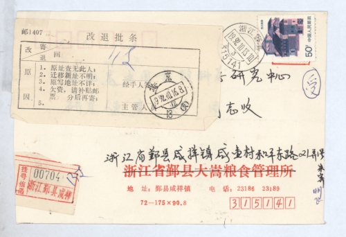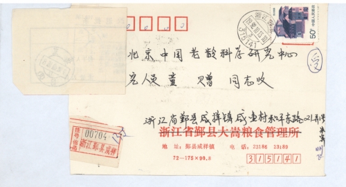 通信处:浙江省郑县咸祥镇咸壶村杨家桥头21弄1号朱志堂