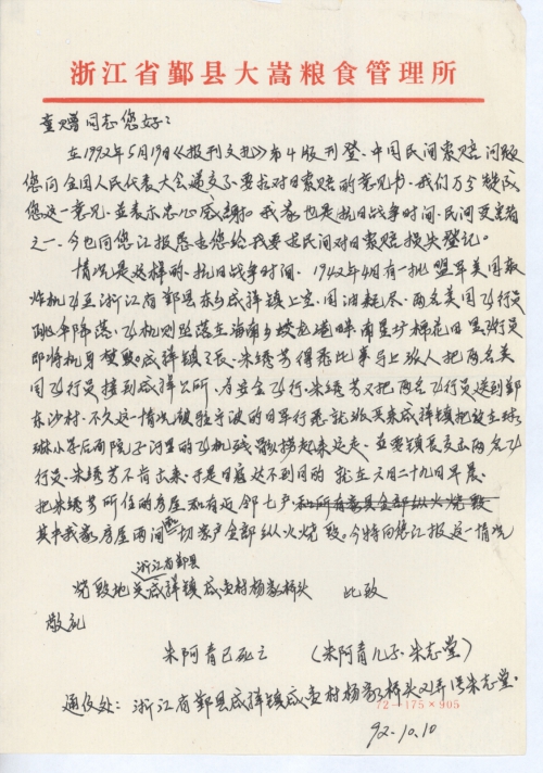 情况是这样的,抗日战争期间,1942年4月有一批盟军美国轰炸机飞至浙江省郑县东乡咸祥镇上空,因油耗尽,两名美国飞行员跳伞降落,飞机则坠落在海南乡蛟龙港畔,南星圹棉花田里,飞行员即将机身焚毁。咸祥镇镇长朱绣芳得悉此事马上派人把两名美国飞行员接到咸祥镇公所,为安全飞行,朱绣芳又把两名飞行员送到郑东沙村,不久这一情况被驻宁波的日军行悉就派兵来咸祥镇把设在球琳小学后面院子河里的飞机残骸捞起来运走,并要镇长交出两名飞行员,朱绣芳不肯出来,于是日寇达不到目的,就在六月二十九日早晨,把朱绣芳所住的房屋和有近邻七户,其中我家房屋两间和一切家产全部纵火烧毁。今特向您汇报这一情况。烧毁地点:浙江省郑县咸祥镇咸壶村杨家桥头