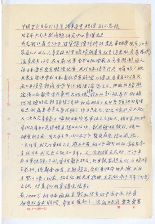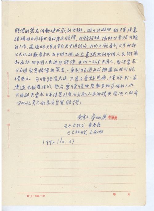 在1000万被日本疯狂杀戮和伤害的中国平民伤员都有权要求赔偿,童先生发起了一次向日本国要求受害赔偿的签名活动使我感到兴趣,难以计数的被日军残暴蹂躏的中国妇女有权要求赔偿,我愿站出来,协助对索赔问题的工作,适值日本天皇及皇后来中国访问,我们不愿看到天皇那种公式化的歉意方式,在中国出现,而应真诚地向中国人民谢罪和承认向中国人民进行赔偿,我们一亿多中国人,坚决要求日本国受害赔偿的签名,一直到日本国正式谢罪和进行赔偿为止。可惜路途太远,不易与童先生见面,僅将我一家遭遇先报告你们,然后要慢慢的发动多数受难的人民共同起来要求日本侵略行为而引起人民的损失,坚决不放弃1800亿美元的民间受害赔偿。