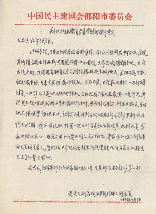 1944年8月,日本反动政府法西斯军队为了永久侵略中国,实现其东南亚共荣圈的野心,大举进攻湖南省腹地。日寇压境之时,我亲眼目睹自己的老父亲刘俊德被抓去做挑夫,因挑不起重担被打成重伤,变成终身残疾而致死;同年九月,日寇第二次进村,一边打掳掠夺,一边进行惨无人道的奸杀,不仅把我全家木器家具一烧而光,并把我在劫难逃的嫂子李松岗施行强奸,进而将我胞兄刘乐平抓去挑夫。当时他气愤填膺,坚决不从,就用刺刀朝他胸部腹部连刺数刀,把大小肠都抠出来了,惨不胜睹,当地群众和我家人泣不成声。此情此景,我至今记忆犹新。现在仅仅幸存我和同胞姐姐刘秀真,她家境比我困难,离我老家湖南省邵东县榎江乡芦山村仅有五里之遥,疾病缠身,迫切希望得到日本政府的赔偿二百万美元。请转报日本驻华使馆