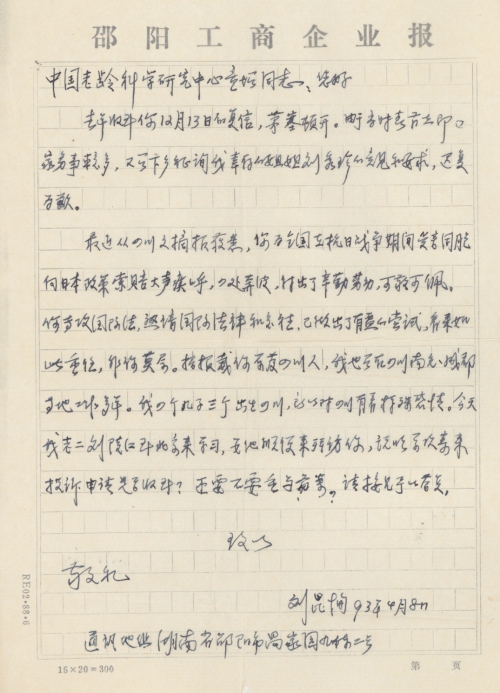 去年收到你12月13日的复信,茅塞顿开。由于当时春节在即,家务事较多,又曾下乡征询我幸存的姐姐刘秀珍的意见和要求,迟复为歉。