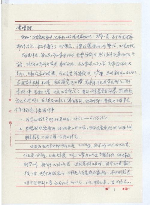 我自退休后,每天早上参加集体活动,打拳练剑等,然后就是买菜做饭等家务,晚饭后再外出散步,身体还好。因为要供儿子上学,老伴退休后又去打工,主教汽车修理课。我们这里待遇较低,15元/课,平均每月有几百元收入,家庭基本平静和睦,自我感觉还不错,基本属于知足常乐型的。关于索赔一事,看来已无望,也就不去想它了,看到许多受害者讨回一些赔款实在太艰难了,我只是在电视上偶尔看到,现平时即不看报也不看杂志,今写信给您,主要两件事: